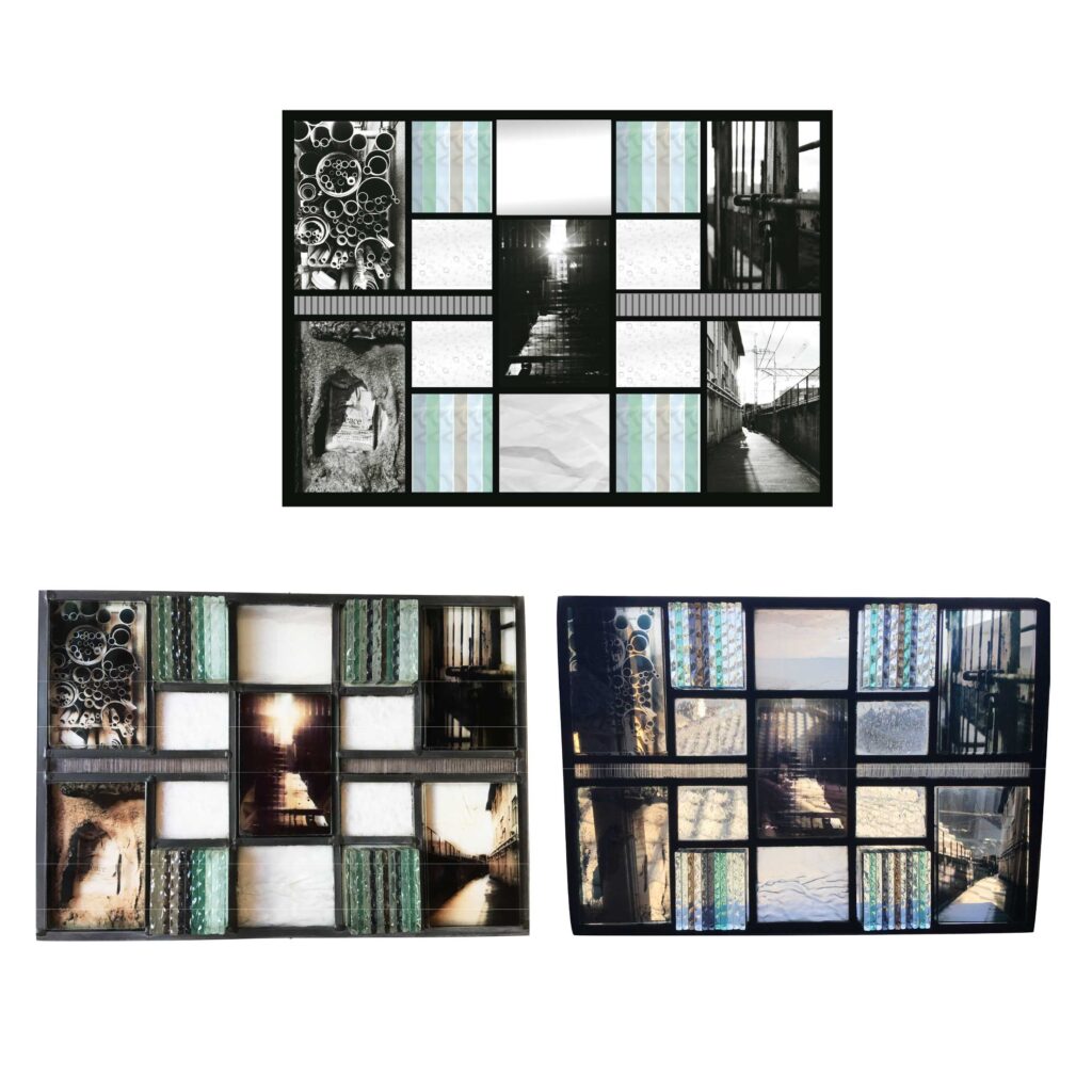 私が20 歳の誕生日にプレゼントしてもらった一眼レフカメラで誕生日翌日に自宅から駅までの道のりを夢中で写真に撮りました。その時に取った写真をパネルに閉じ込めてその時のワクワク感や感性を大切にしたいと思い作りました。写真はフィルム写真だったのでネガを写真屋さんに持ち込みデータ化してもらい、自宅のプリンタでOHP フィルムにプリントし透けるようにしました。ガラスとガラスの間にフィルムを挟み透過性の高い接着剤で固めました。